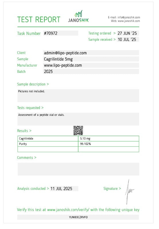 https://verify.janoshik.com/tests/70972-Cagrilintide_5mg_YUNI83C2RVFD