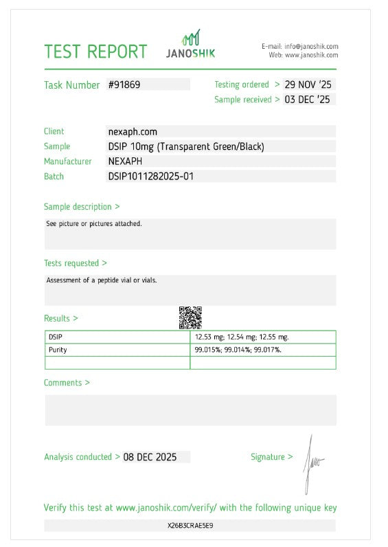 https://janoshik.com/tests/91869-DSIP_10mg_Transparent_GreenBlack_X26B3CRAE5E9
