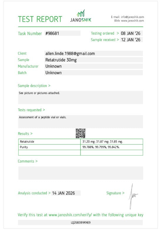 https://verify.janoshik.com/tests/98681-retatrutide_30mg_LQ2GB38VKNE9